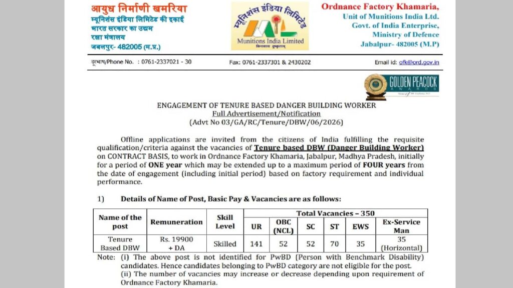 Ordnance Factory Khamaria Recruitment 2026: डेंजर बिल्डिंग वर्कर के 350 पदों पर भर्ती का मौका, बिना परीक्षा के सिर्फ मेरिट के आधार पर होगी भर्ती